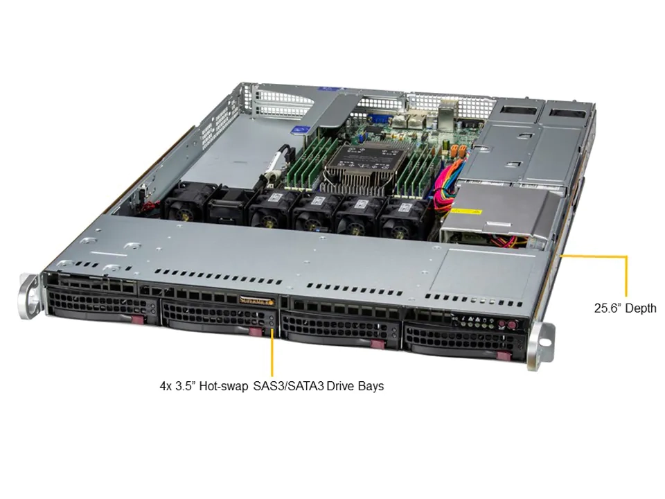 1Uラックマウントシャーシにインテル® Xeon® スケーラブル・プロセッサーを1基、3.5インチ ドライブを最大4台搭載する1Uラックマウントサーバです。